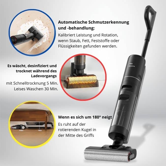 Mit Vibra Dreame H12 Pro kann kein Staub, Fett, Feststoff oder Flüssigkeit entweichen, er wird im ersten Durchgang aufgesaugt.