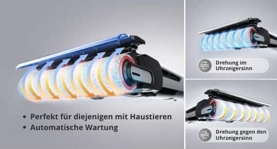 Dank des Schabers und der Zweirichtungsdrehung im und gegen den Uhrzeigersinn können sich Haare und Fell nicht an der Bürste verfangen und werden so in den Behälter gesaugt. So sparen Sie sich stundenlanges Reinigen des Staubsaugers mit der Gefahr, ihn zu beschädigen.