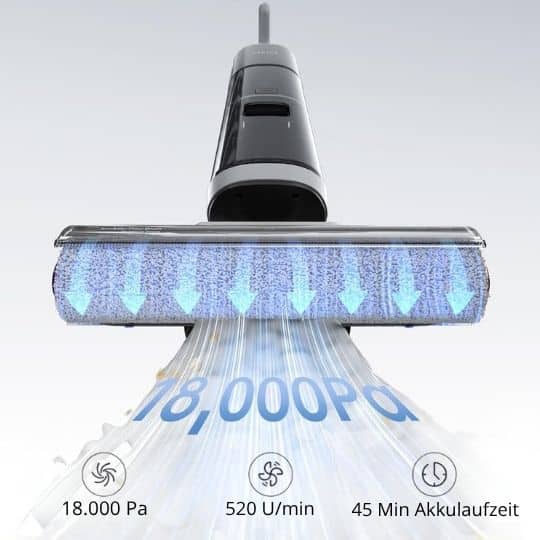 Wir sprechen hier von 18.000 Pa und 520 U/min , in der Praxis ist die Leistung so hoch, dass ein Teil des Schmutzes aufgesaugt wird, noch bevor man mit der Bürste darüber fährt.