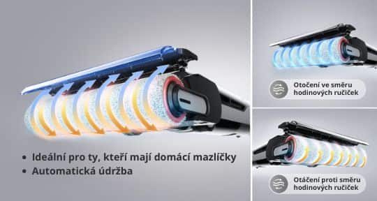 Díky škrabce a obousměrnému otáčení (ve směru a proti směru hodinových ručiček) se vlasy a chlupy nezamotávají do kartáče, ale jsou nasávány do nádoby na prach. To vám ušetří hodiny úklidu a zabrání poškození vysavače.