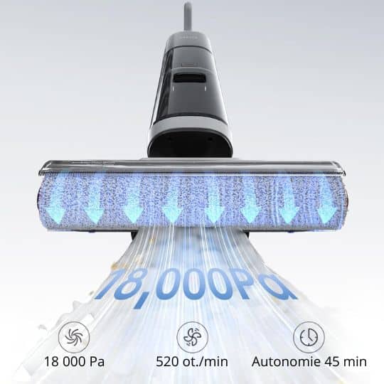 Mluvíme o 18 000 Pa a 520 otáčkách za minutu , v praxi je to takový výkon, že část nečistot je nasáta dříve, než po nich kartáč přejede.